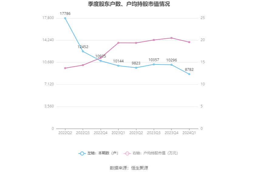 筹码集中度方面,截至2024年一季度末,公司股东总户数为8782户,较上年末下降了1514户,降幅14.70%;户均持股市值由上年末的20.52万元下降至19.58万元,降幅为4.58%。