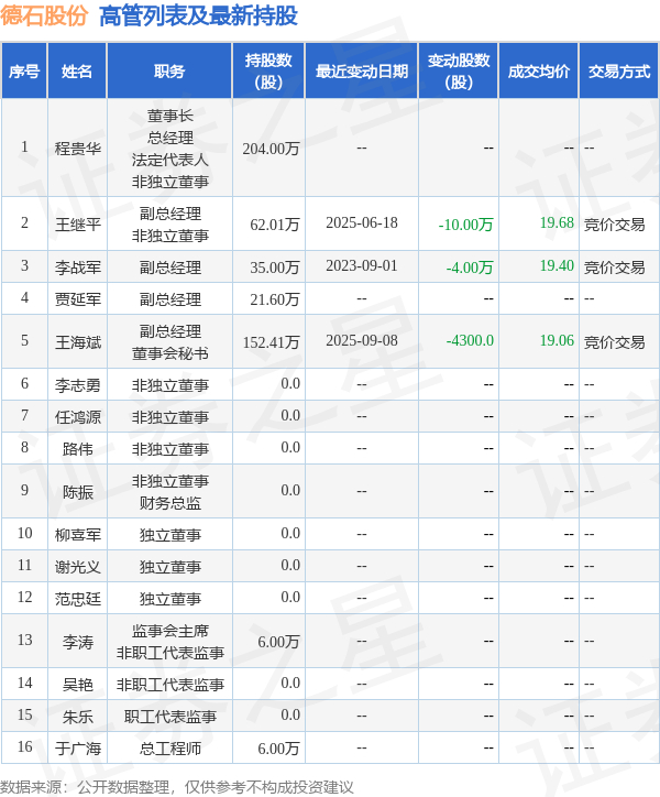德石股份的高管列表及最新持股情况如下: