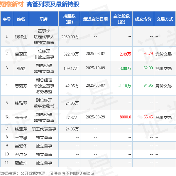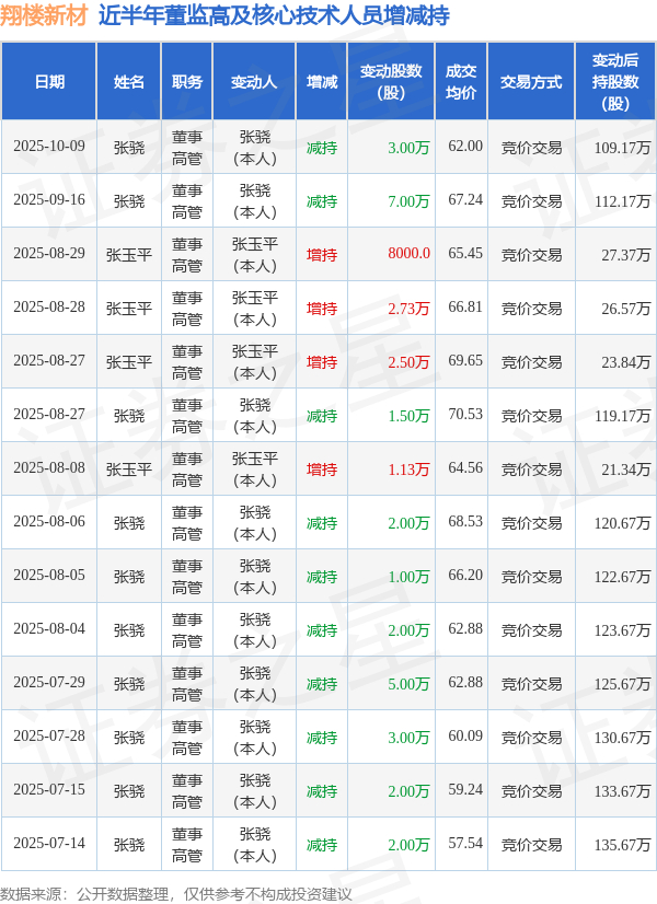 翔楼新材近半年内的董监高及核心技术人员增减持详情如下: