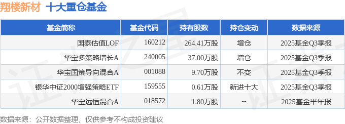 持有翔楼新材最多的基金为国泰估值LOF,目前规模为15.66亿元,最新净值4.1731(10月29日),较上一交易日上涨1.03%,近一年上涨61.94%。该基金现任基金经理为王兆祥。