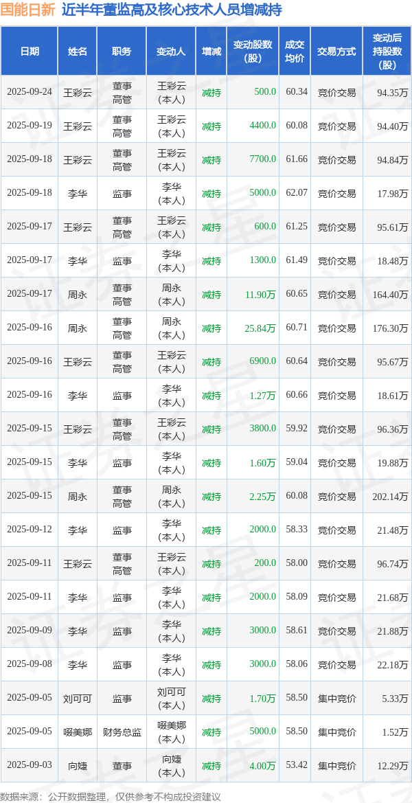 国能日新近半年内的董监高及核心技术人员增减持详情如下: