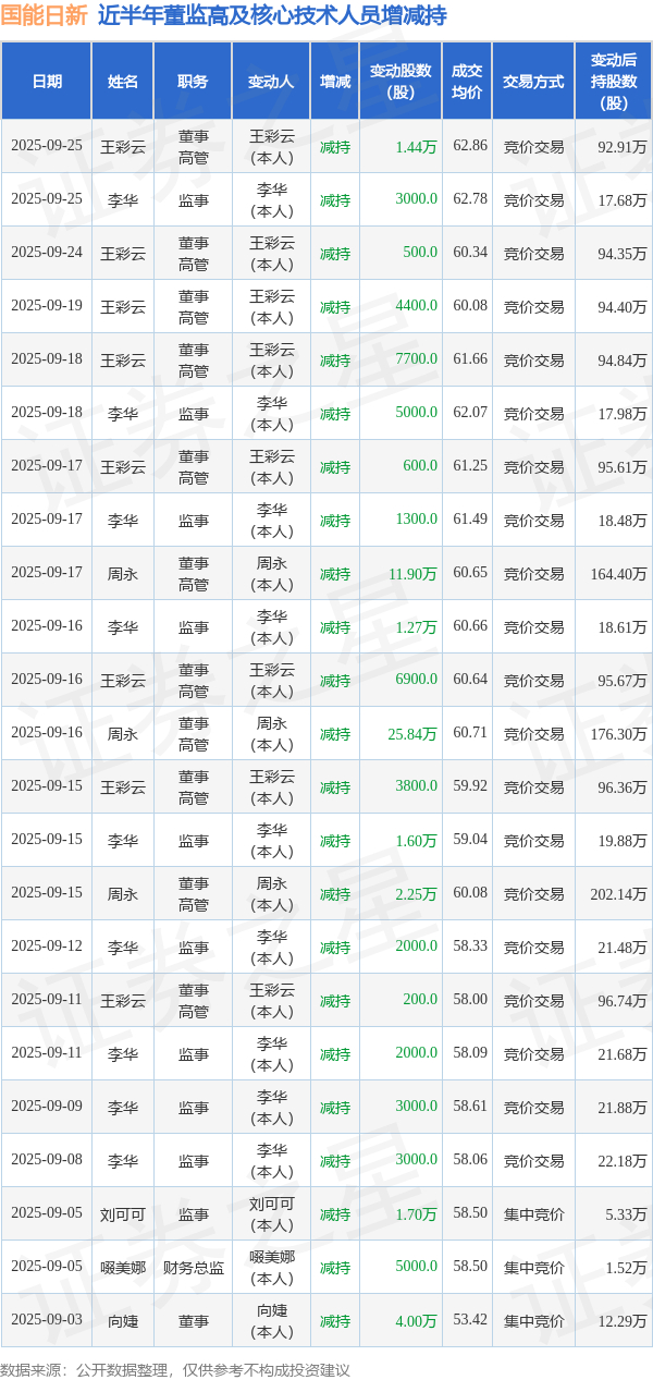 国能日新:9月25日高管王彩云、李华减持股份合计1.74万股
