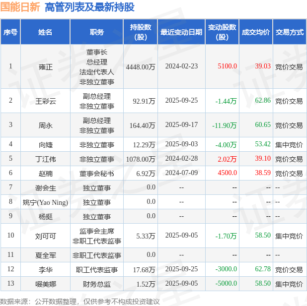国能日新近半年内的董监高及核心技术人员增减持详情如下: