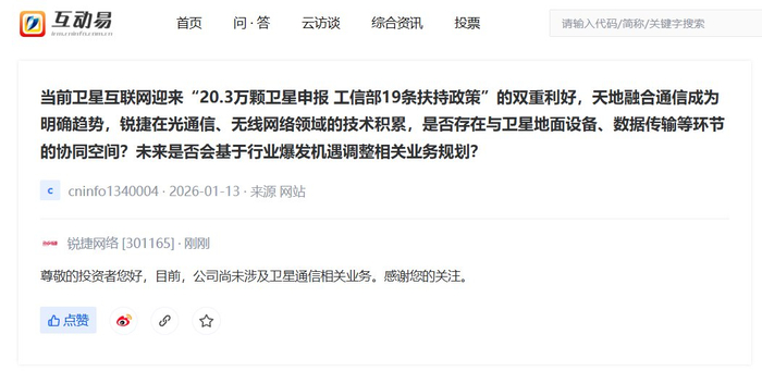 V观财报丨锐捷网络:尚未涉及卫星通信相关业务