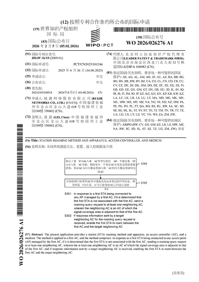 锐捷网络公布国际专利申请:“无线终端漫游方法、装置、接入控制器及介质”