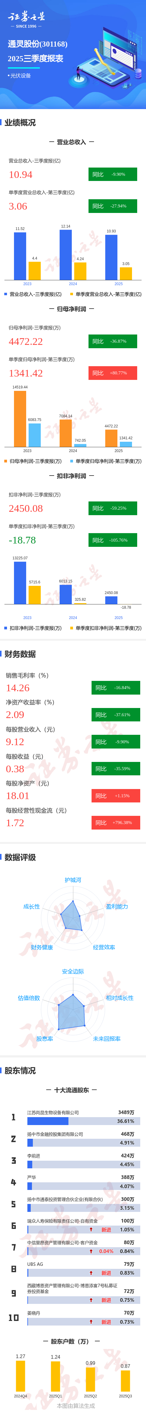 证券之星消息,通灵股份2025年三季报显示,前三季度公司主营收入10.94亿元,同比下降9.91%;归母净利润4472.22万元,同比下降36.87%;扣非净利润2450.08万元,同比下降59.25%;其中2025年第三季度,公司单季度主营收入3.06亿元,同比下降27.95%;单季度归母净利润1341.42万元,同比上升80.77%;单季度扣非净利润-18.78万元,同比下降105.76%;负债率35.32%,投资收益1418.02万元,财务费用-649.69万元,毛利率14.26%。