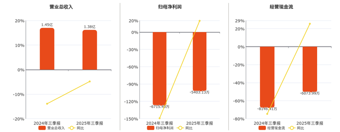 公司营业总收入为1.38亿元,较去年同报告期营业总收入减少697.56万元,同比较去年同期下降4.82%。归母净利润为-5403.13万元。经营活动现金净流入为-6073.99万元。