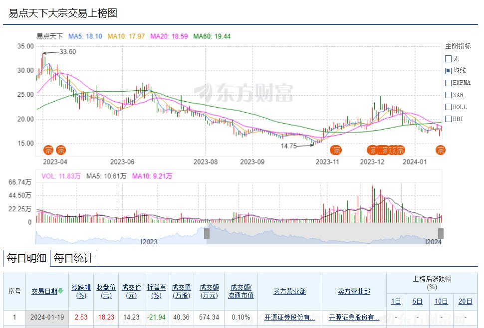 易点天下19日大宗交易成交40.36万股 折价率21.94%