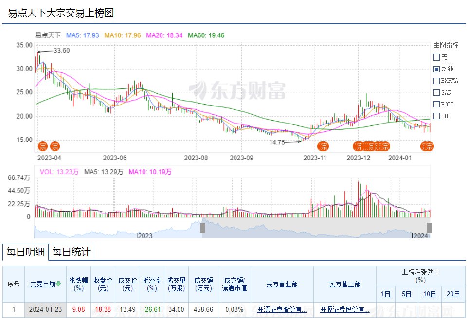 上证报中国证券网讯 据东方财富Choice数据,易点天下昨日(1月23日)发生1笔大宗交易,成交量为34万股,成交金额458.66万元,成交价为13.49元,较当日收盘价折价26.61%。