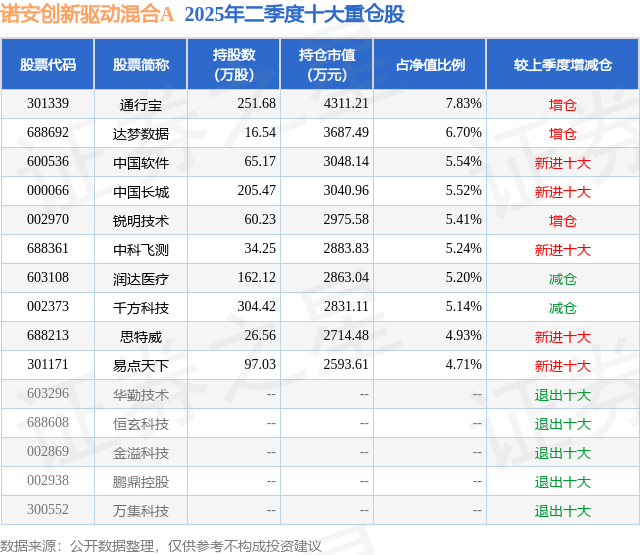 诺安创新驱动混合A的前十大重仓股如下: