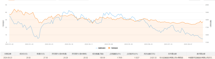 8月23日大宗交易成交126万股,成交额2623.32万元,占当日总成交额的10.41%,成交价20.82元,较市场收盘价27.5元折价24.29%。