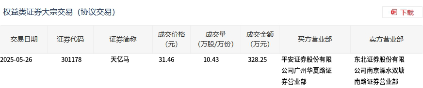 天亿马今日大宗交易折价成交10.43万股,成交额328.25万元