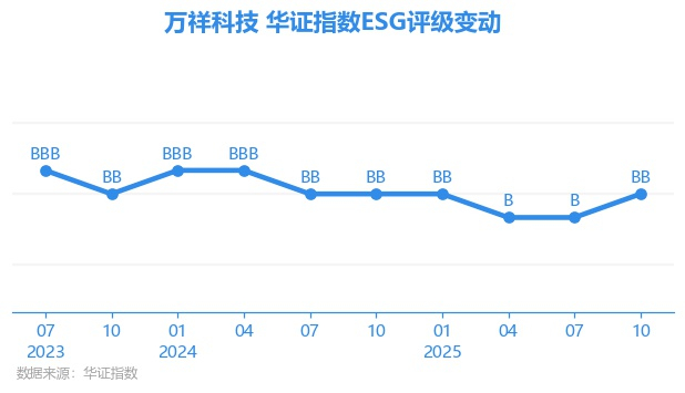 日前,华证指数公布了新一期(2025年10月31日)的ESG评级结果,万祥科技(301180.SZ)获得BB评级(华证指数评级为C起至AAA九档,C为最低档,AAA为其最高一级评级/AA为其第二档),上一期(2025年7月31日)ESG评级为B。本期ESG评级在531家电子设备、仪器和元件行业A股上市公司中排名第275(上一期排名第309)。