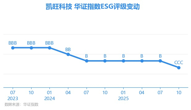 日前,华证指数公布了新一期(2025年10月31日)的ESG评级结果,凯旺科技(301182.SZ)获得CCC评级(华证指数评级为C起至AAA九档,C为最低档,AAA为其最高一级评级/AA为其第二档),上一期(2025年7月31日)ESG评级为B。本期ESG评级在531家电子设备、仪器和元件行业A股上市公司中排名第488(上一期排名第380)。