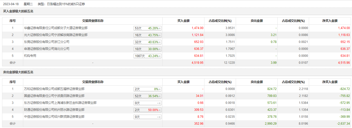 具体来看,机构合计净买入634.81万元。此外,知名游资现身龙虎榜,华鑫证券成都交子大道证券营业部、光大证券宁波解放南路证券营业部分别买入1474.00万元、1121.84万元;万和证券成都五福桥证券营业部、宁波桑田路(国盛证券宁波桑田路证券营业部)分别卖出824.72万元、789.83万元。
