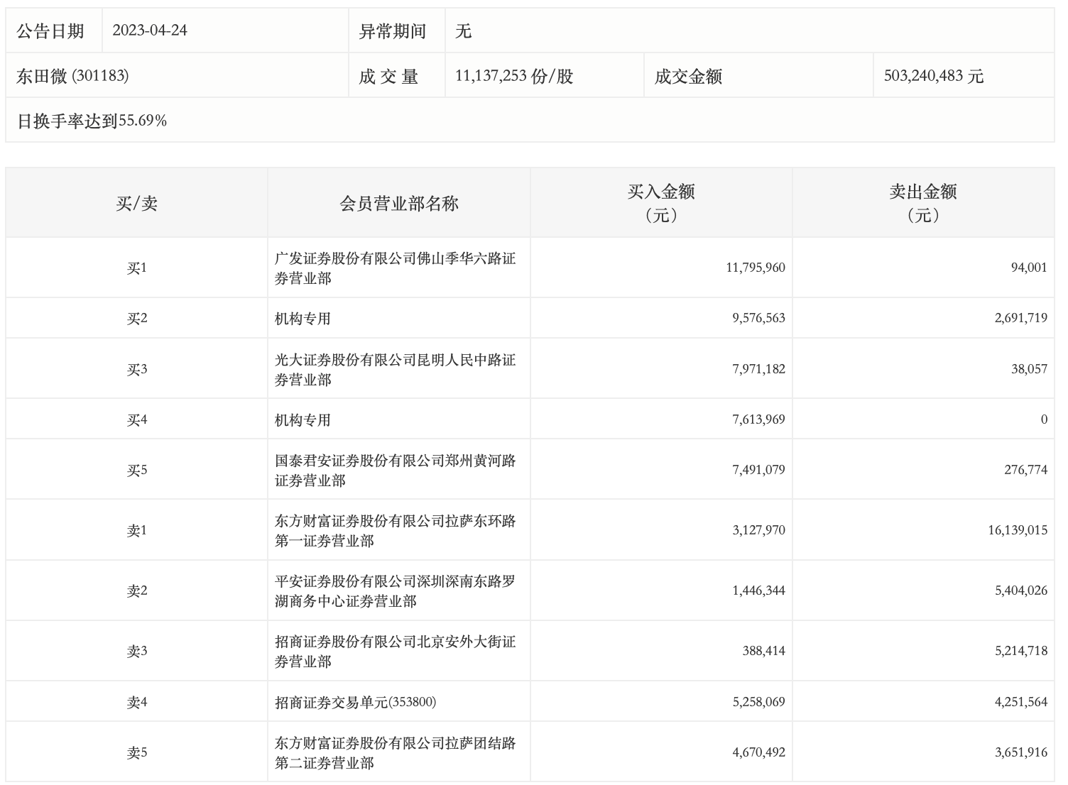 4月24日,东田微今日涨停,龙虎榜数据显示,上榜营业部席位全天成交9710.18万元,占当日总成交金额比例为19.3%。其中,买入金额为5934.0万元,卖出金额为3776.18万元,合计净买入2157.83万元。