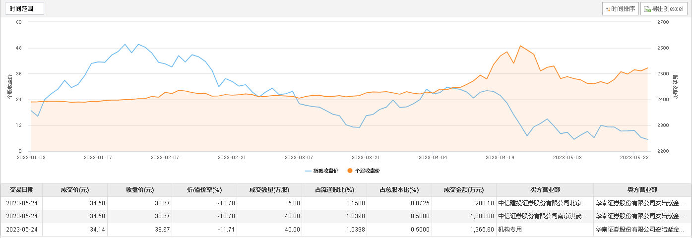 东田微5月24日大宗交易成交85.8万股,成交额2945.7万元,占当日总成交额的6.88%,成交均价34.33元,较市场收盘价38.67元折价11.22%,其中最高成交价34.5元,最低成交价34.14元。