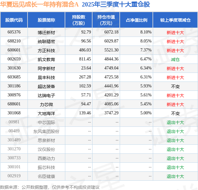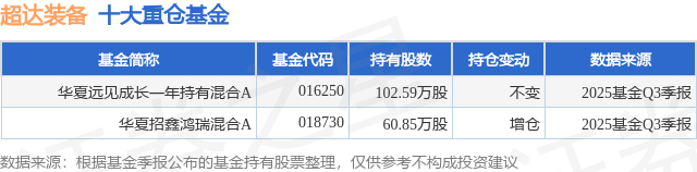 根据2025基金Q3季报公募基金重仓股数据,重仓该股的公募基金共2家,其中持有数量最多的公募基金为华夏基金的华夏远见成长一年持有混合A。华夏远见成长一年持有混合A目前规模为6.0亿元,最新净值1.2997(11月20日),较上一交易日下跌0.73%,近一年上涨40.05%。该公募基金现任基金经理为钟帅。钟帅在任的基金产品包括:华夏行业景气混合A,管理时间为2020年7月28日至今,期间收益率为172.04%;华夏招鑫鸿瑞混合A,管理时间为2024年1月16日至今,期间收益率为102.28%;华夏卓越成长混合A,管理时间为2025年8月12日至今,期间收益率为10.57%。