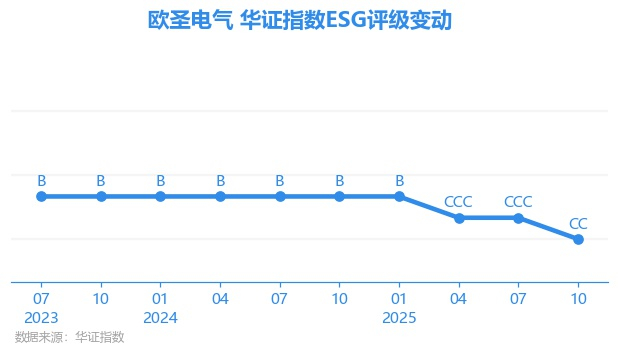 日前,华证指数公布了新一期(2025年10月31日)的ESG评级结果,欧圣电气(301187.SZ)获得CC评级(华证指数评级为C起至AAA九档,C为最低档,AAA为其最高一级评级/AA为其第二档),上一期(2025年7月31日)ESG评级为CCC。本期ESG评级在148家家庭耐用消费品行业A股上市公司中排名第102(上一期排名第98)。