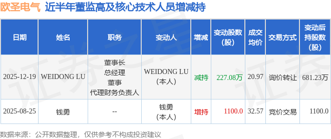 欧圣电气近半年内的董监高及核心技术人员增减持详情如下: