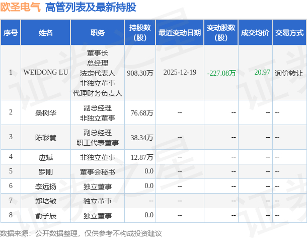 欧圣电气的高管列表及最新持股情况如下: