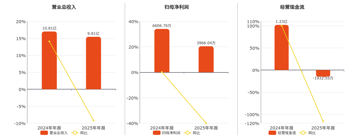 公司营业总收入为9.81亿元,较去年同报告期营业总收入减少9937.01万元,同比较去年同期下降9.19%。归母净利润为3966.04万元,较去年同报告期归母净利润减少2640.72万元,同比较去年同期下降39.97%。经营活动现金净流入为-1932.55万元,较去年同报告期经营活动现金净流入减少1.42亿元,同比较去年同期下降115.71%。