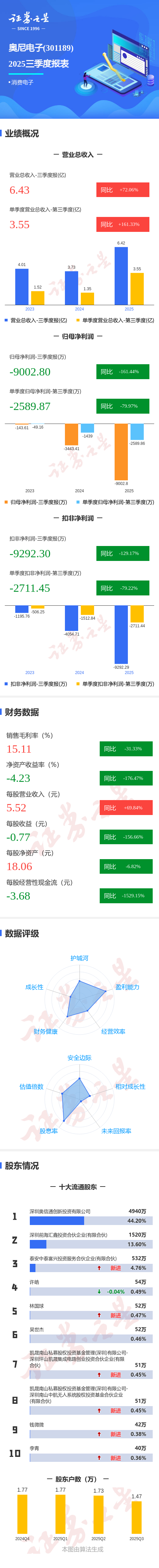 图解奥尼电子三季报:第三季度单季净利润同比下降79.98%