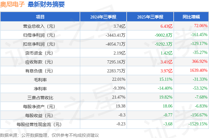 据证券之星公开数据整理,近期奥尼电子(301189)发布2025年三季报。截至本报告期末,公司营业总收入6.43亿元,同比上升72.06%,归母净利润-9002.8万元,同比下降161.45%。按单季度数据看,第三季度营业总收入3.55亿元,同比上升161.34%,第三季度归母净利润-2589.87万元,同比下降79.98%。本报告期奥尼电子存货明显上升,存货同比增幅达116.72%。