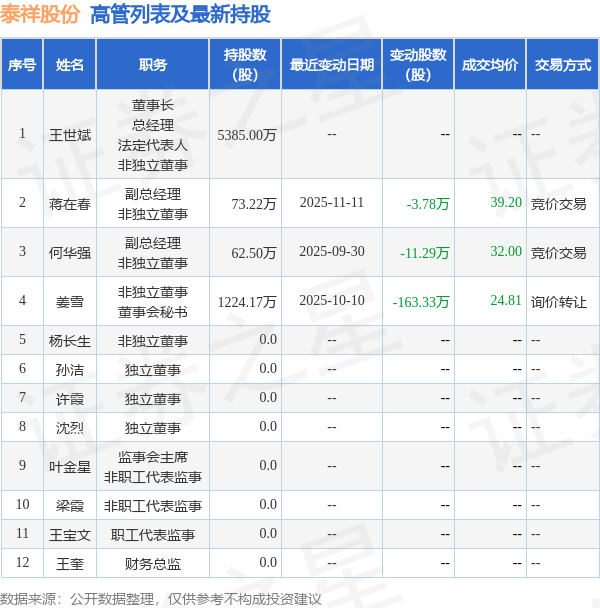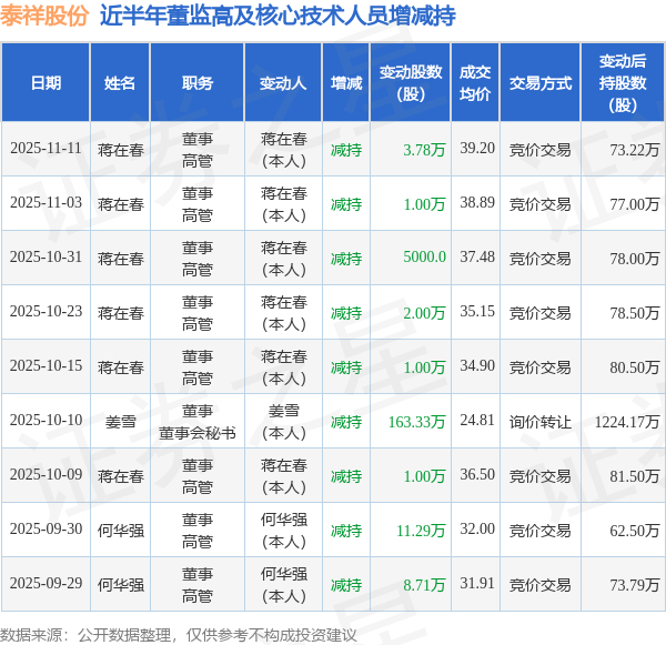 泰祥股份近半年内的董监高及核心技术人员增减持详情如下: