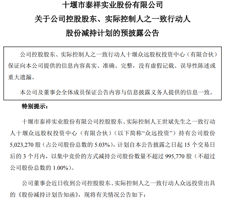 11月12日,泰祥股份(301192.SZ)发布公告,公司控股股东、实际控制人王世斌先生之一致行动人十堰众远股权投资中心(有限合伙)(简称“众远投资”)持有公司股份502.33万股(占公司股份总数的5.03%),计划自公告披露之日起15个交易日后的3个月内,以集中竞价的方式减持公司股份数量不超过99.58万股(不超过公司股份总数的1%)。