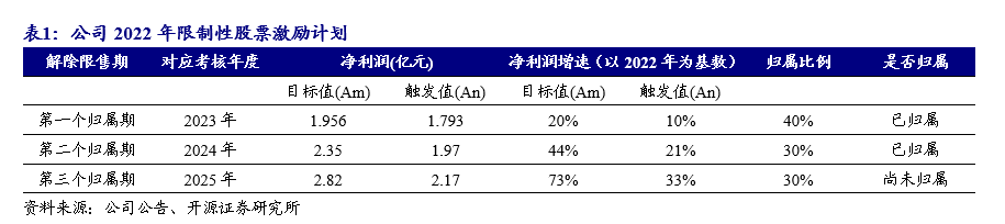 股权激励深度绑定核心骨干,高目标彰显增长信心。公司于2022年12月26日披露《2022年度限制性股票激励计划草案》,拟向激励对象授予限制性股票总量387.7万股,占草案公告日公司总股本的3.11%。初始授予价格为17.92元/股,经2023-2024 年权益分派调整后,最终授予价格确定为15.82元/股。