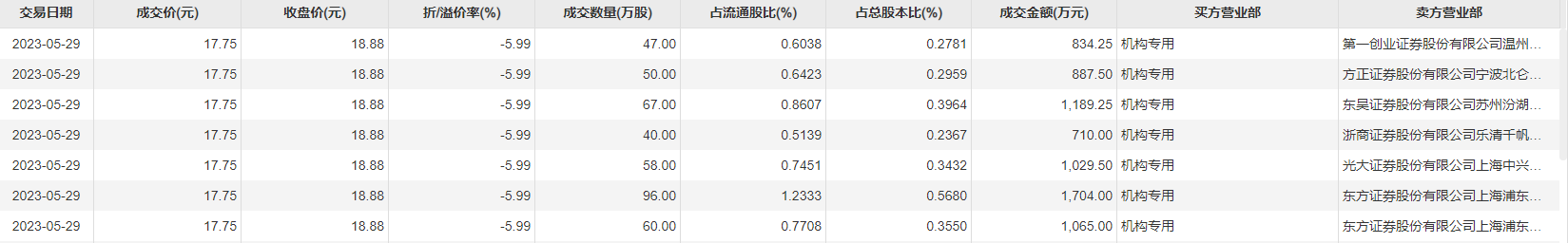 5月29日大宗交易成交418万股,成交额7419.5万元,占当日总成交额的44.27%,成交价17.75元,较市场收盘价18.88元折价5.99%。