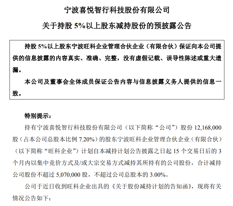 11月3日,喜悦智行(301198.SZ)发布公告,持股7.20%的股东宁波旺科企业管理合伙企业(有限合伙)(简称“旺科企业”)计划自本减持计划公告披露之日起15个交易日后的3个月内以集中竞价方式及/或大宗交易方式减持其所持有的公司股份,合计减持公司股份不超过507万股,不超过公司总股本的3%。