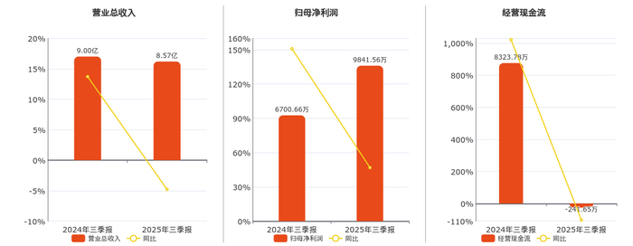 公司营业总收入为8.57亿元,较去年同报告期营业总收入减少4299.72万元,同比较去年同期下降4.78%。归母净利润为9841.56万元。经营活动现金净流入为-241.65万元,较去年同报告期经营活动现金净流入减少8565.43万元,同比较去年同期下降102.90%。