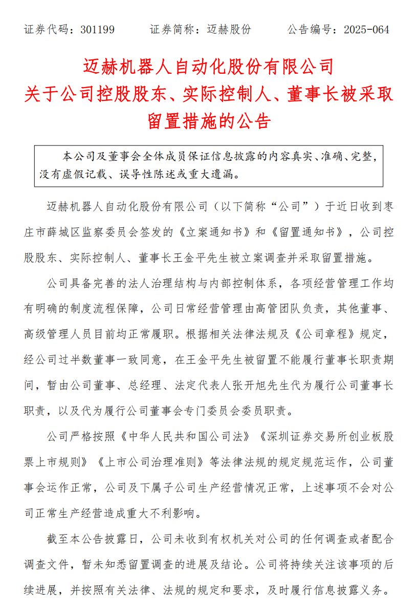 近日,迈赫股份(301199.SZ)发布公告称,公司董事长王金平因被枣庄市薛城区监察委员会采取留置措施,已无法正常履行职务。