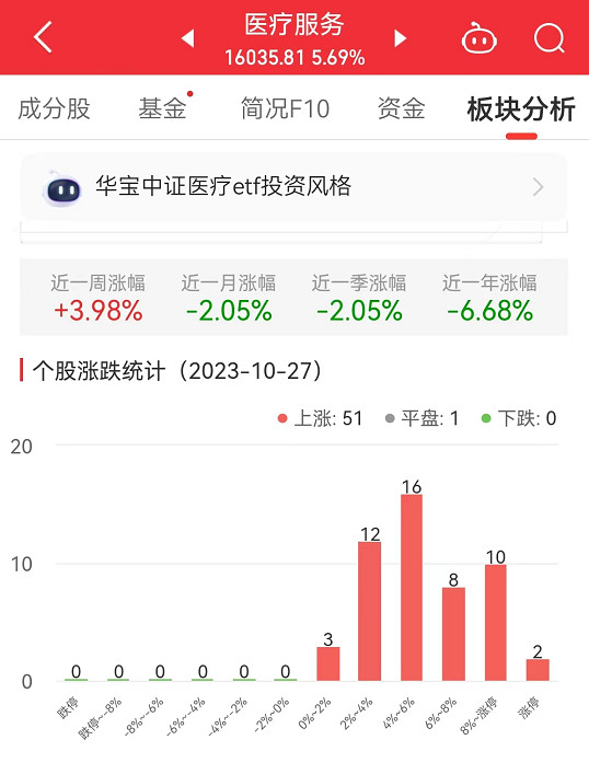 数据显示,截至今日,医疗服务板块近一周涨幅3.98%,近一月涨幅-2.05%,近一季涨幅-2.05%。