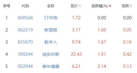 ST中珠(维权)、新里程(维权)、数字人、迪安诊断、美年健康位列涨幅榜后五位,涨幅分别为0.00%、1.60%、1.67%、1.91%、2.14%。