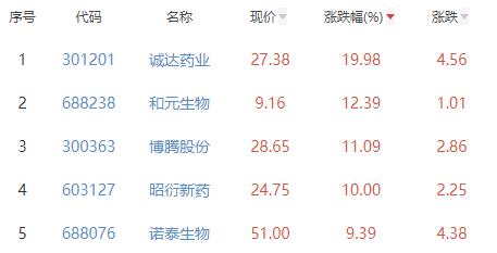 其中,诚达药业、和元生物、博腾股份(维权)、昭衍新药、诺泰生物位列板块涨幅前五位,涨幅分别为19.98%、12.39%、11.09%、10.00%、9.39%。