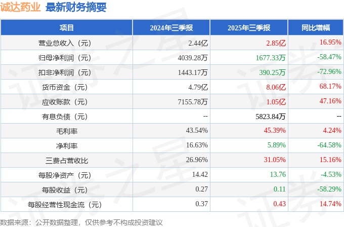 据证券之星公开数据整理,近期诚达药业(301201)发布2025年三季报。根据财报显示,诚达药业增收不增利。截至本报告期末,公司营业总收入2.85亿元,同比上升16.95%,归母净利润1677.33万元,同比下降58.47%。按单季度数据看,第三季度营业总收入1.03亿元,同比上升28.69%,第三季度归母净利润394.89万元,同比下降74.05%。