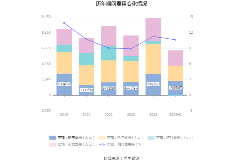 2024年上半年,公司期间费用为5908.32万元,较上年同期增加1125.11万元;但期间费用率为10.65%,较上年同期下降0.74个百分点。其中,销售费用同比增长75.36%,管理费用同比增长1.29%,研发费用同比增长49.86%,财务费用由去年同期的318.01万元变为-98.96万元。