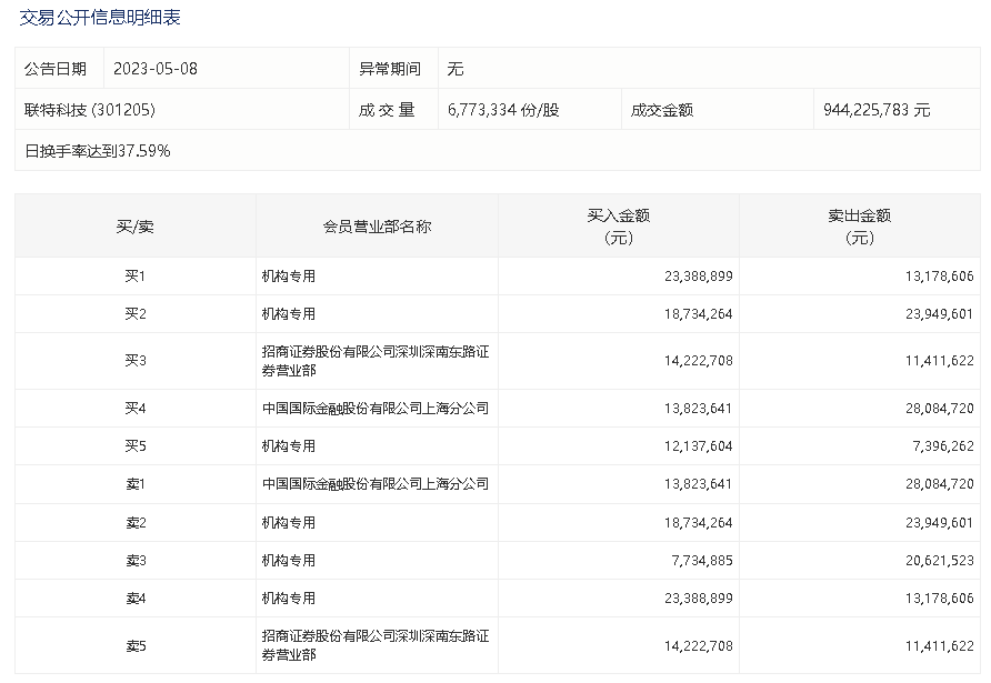 5月8日,联特科技今日涨16.9%,龙虎榜数据显示,上榜营业部席位全天成交1.95亿元,占当日总成交金额比例为20.62%。其中,买入金额为9004.2万元,卖出金额为1.05亿元,合计净卖出1460.03万元。