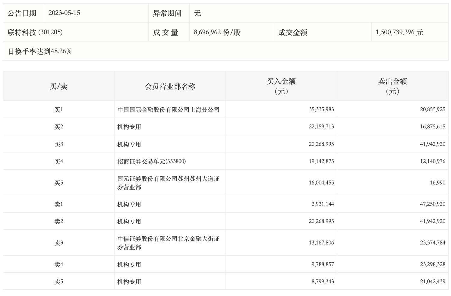 5月15日,联特科技今日涨停,龙虎榜数据显示,上榜营业部席位全天成交3.54亿元,占当日总成交金额比例为23.61%。其中,买入金额为1.48亿元,卖出金额为2.07亿元,合计净卖出5919.97万元。