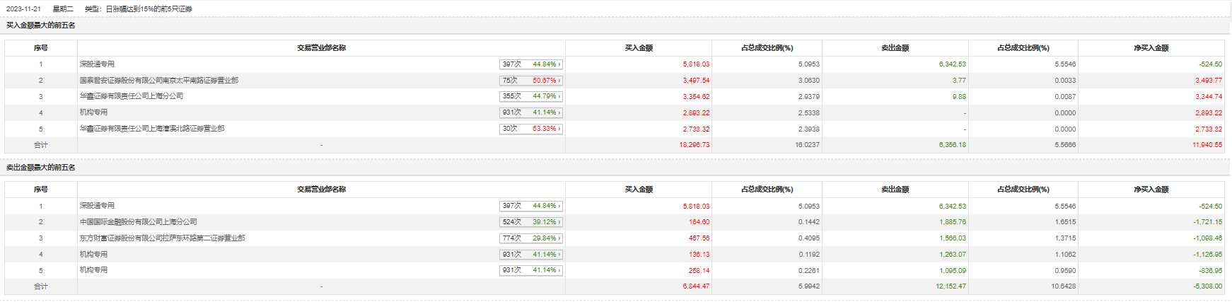 11月21日,联特科技今日涨停,龙虎榜数据显示,上榜营业部席位全天成交3.15亿元,占当日总成交金额比例为27.58%。其中,买入金额为1.93亿元,卖出金额为1.22亿元,合计净买入7157.05万元。