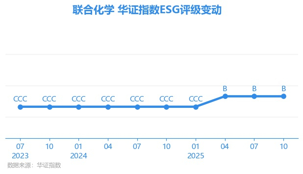 日前,华证指数公布了新一期(2025年10月31日)的ESG评级结果,联合化学(301209.SZ)获得B评级(华证指数评级为C起至AAA九档,C为最低档,AAA为其最高一级评级/AA为其第二档),上一期(2025年7月31日)ESG评级为B。本期ESG评级在494家化学制品行业A股上市公司中排名第245(上一期排名第223)。