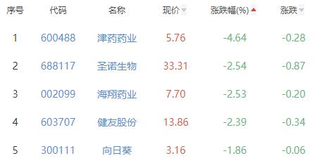 津药药业、圣诺生物、海翔药业、健友股份、向日葵位列涨幅榜后五位,涨幅分别为-4.64%、-2.54%、-2.53%、-2.39%、-1.86%。