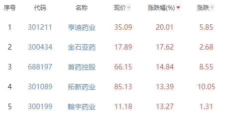 其中,亨迪药业、金石亚药、首药控股、拓新药业、翰宇药业位列板块涨幅前五位,涨幅分别为20.01%、17.62%、14.84%、13.39%、13.27%。