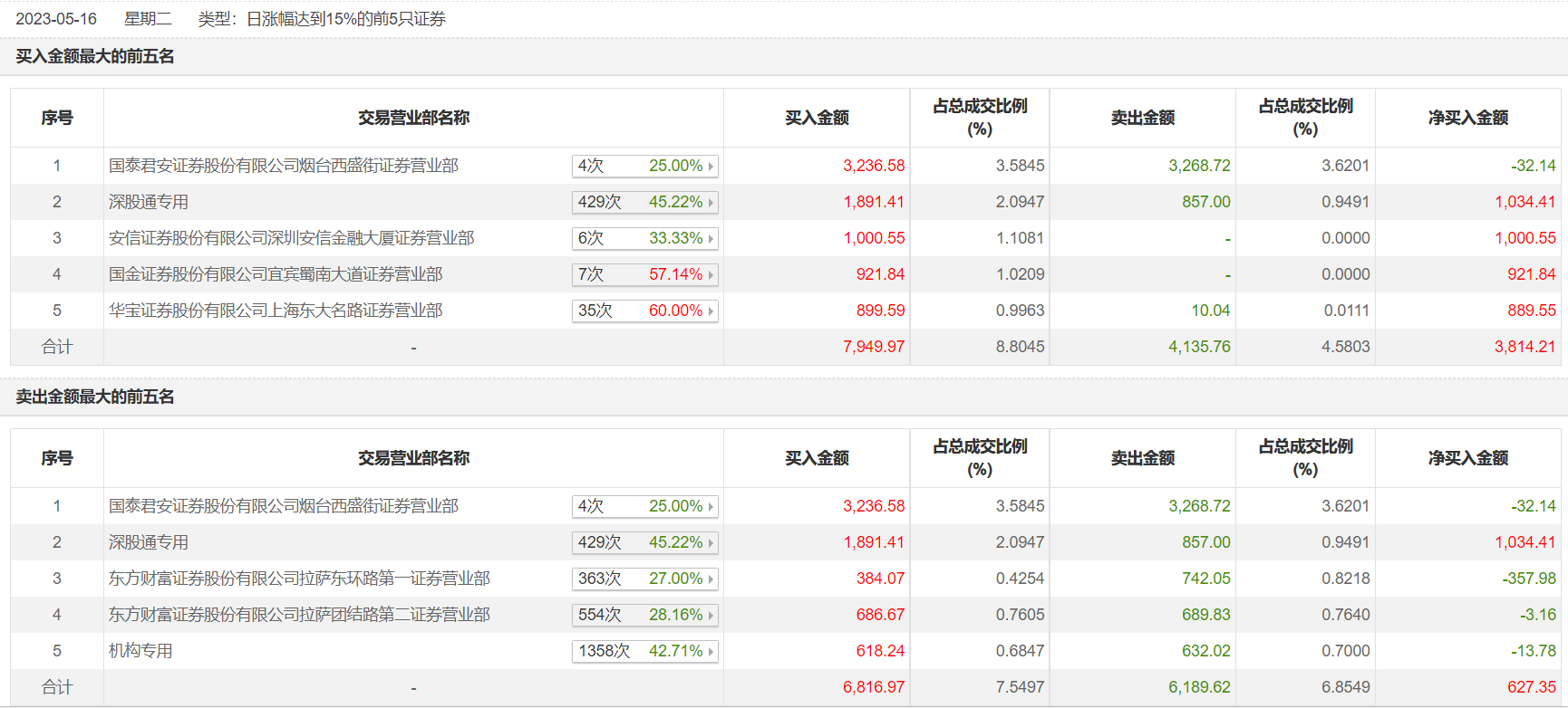 具体来看,机构买入618.24万元,卖出632.02万元,合计净卖出13.78万元。此外,国泰君安证券烟台西盛街证券营业部、深股通专用分别买入3236.58万元、1891.41万元;国泰君安证券烟台西盛街证券营业部、深股通专用分别卖出3268.72万元、857.00万元。