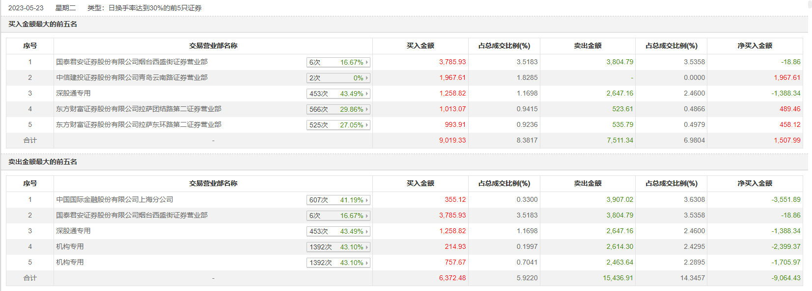 具体来看,机构买入972.6万元,卖出5077.95万元,合计净卖出4105.34万元。此外,国泰君安证券烟台西盛街证券营业部、中信建投证券青岛云南路证券营业部分别买入3785.93万元、1967.61万元;中国国际金融上海分公司、国泰君安证券烟台西盛街证券营业部分别卖出3907.02万元、3804.79万元。