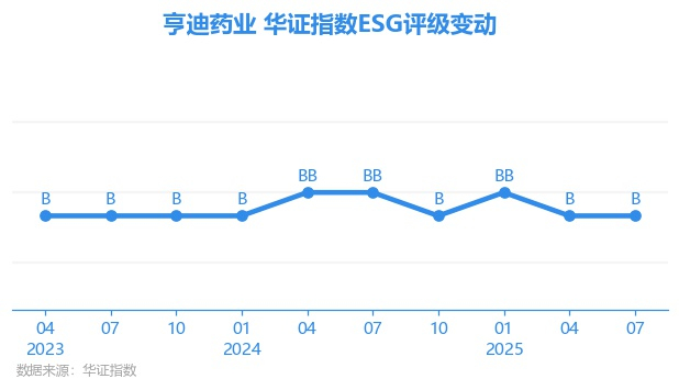 日前,华证指数公布了新一期(2025年7月31日)的ESG评级结果,亨迪药业(301211.SZ)获得B评级(华证指数评级为C起至AAA九档,C为最低档,AAA为其最高一级评级/AA为其第二档),上一期(2025年4月30日)ESG评级为B。本期ESG评级在255家制药行业A股上市公司中排名第142(上一期排名第151)。