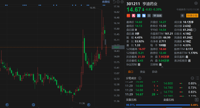 A股异动丨亨迪药业午间收跌5.35% 三名股东拟“组团”减持